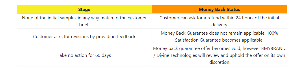 We are so confident of our skills and design quality that we provide Money Back Guarantee in case we fail to deliver. Money Back Guarantee is provided in good faith and we expect our customers to exhibit the same. In majority of the cases customer are very honest, co-operative and provide quality feedback in order to get the designs they want. However there is a minority that tries to take unfair advantage of this flexibility. They will place orders with many providers at the same time, get the design concepts from all and then ask for the money back. This practice is unfair, unethical and abusive of human skills. Apologies, but if you are one of those we would rather not have your business.